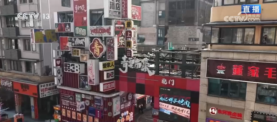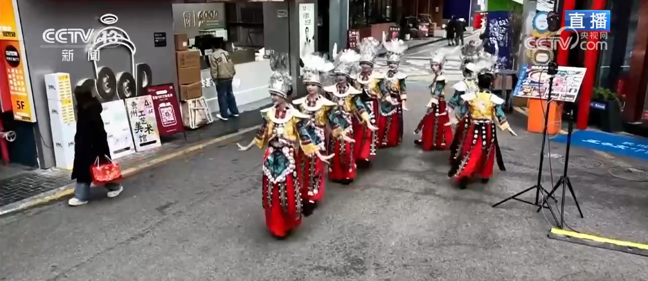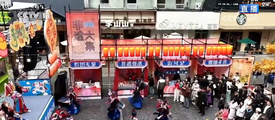 記者來到貴陽市的青云市集,通過航拍鏡頭可以看到,這里是在貴陽老城區(qū)的中心位置。最近幾年,貴陽市通過城市更新,把這里改造成了火爆出圈的文旅街區(qū)?,F(xiàn)在,聽見鼓聲響起,青云市集為了迎新春而專門打造的“非遺集市”正式開市了,臺上正在表演的是貴州省級非物質(zhì)文化遺產(chǎn)——石阡儺戲。