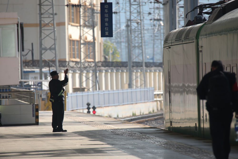 ↑ 2月16日,在昆明站,中鐵昆明局集團的職工進行發(fā)車前的例行檢查。新華社發(fā)(李云生攝)