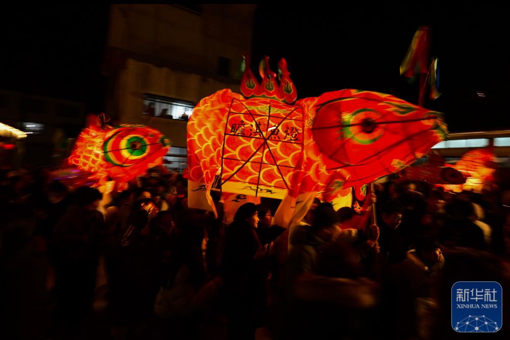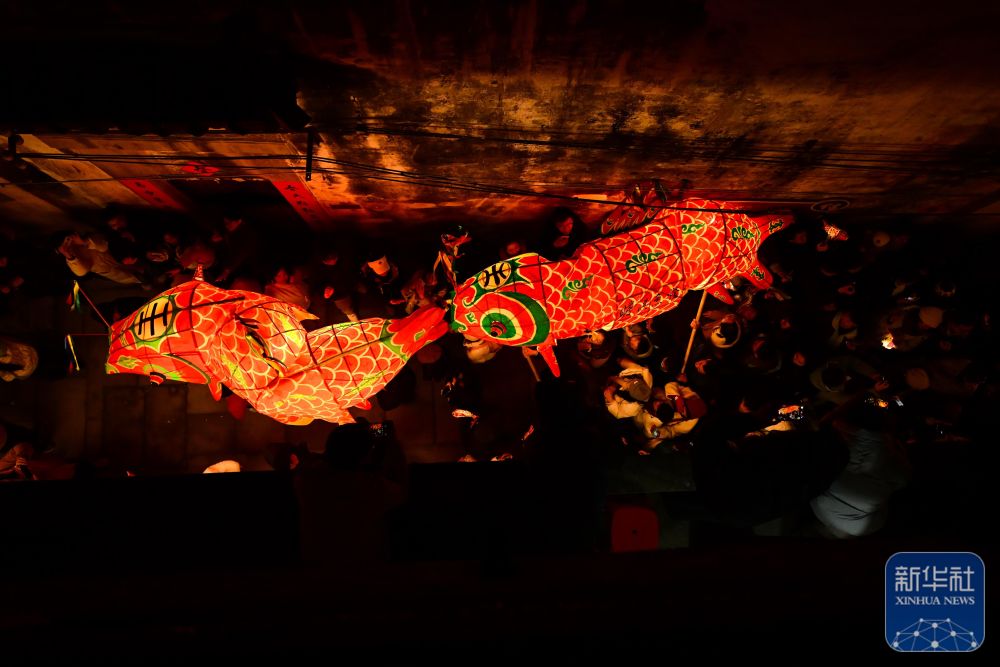 2月7日,瞻淇村魚燈隊在村中表演(無人機照片)。