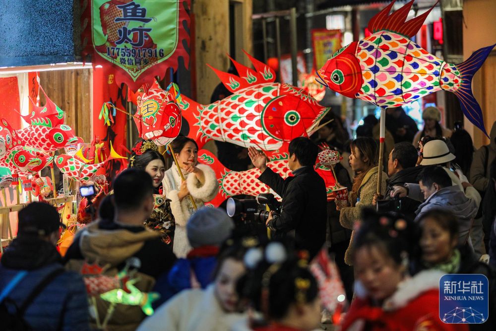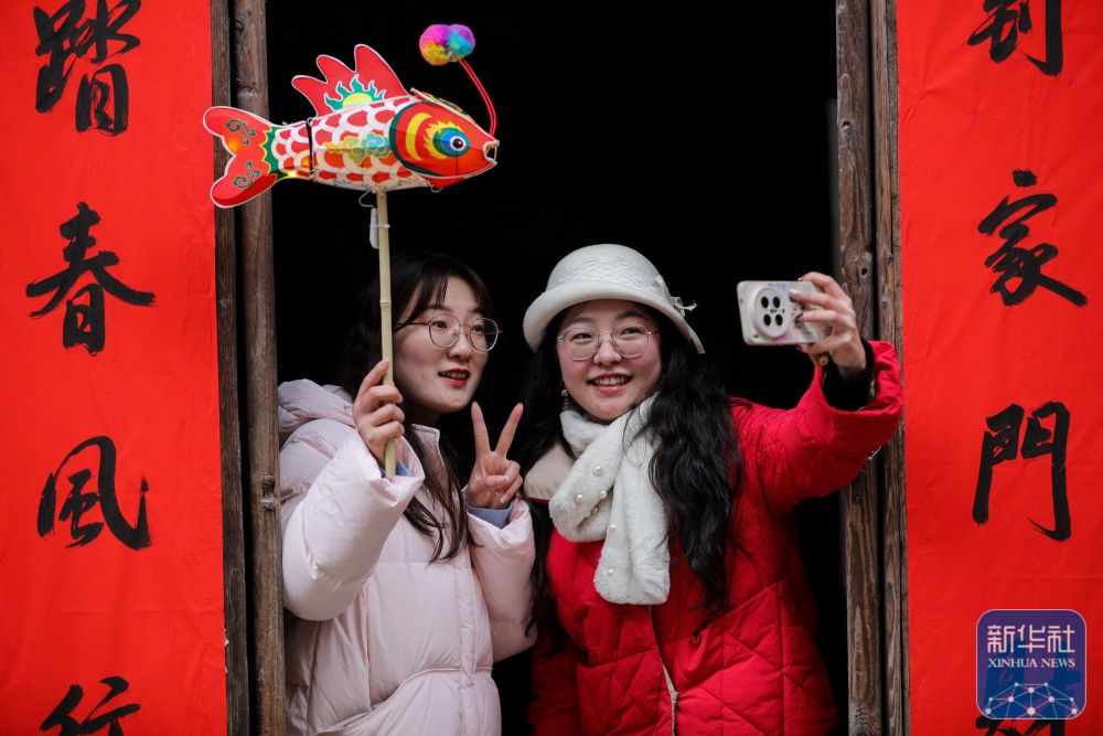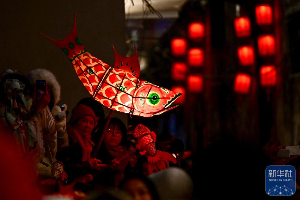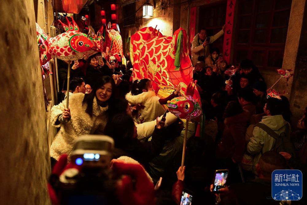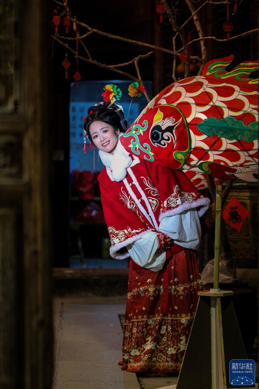 2月7日,游客在瞻淇村里體驗魚燈表演。