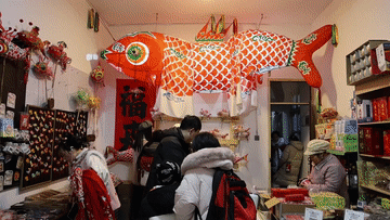 1月29日,在瞻淇村一處店鋪內,工作人員展示售賣的魚燈冰箱貼。