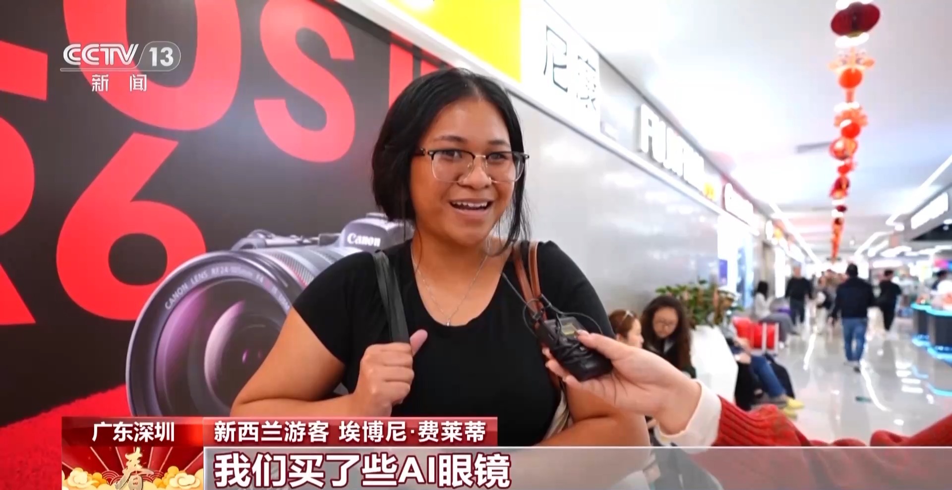 新西蘭游客 埃博尼·費萊蒂:我們買了些AI眼鏡,它讓我們在這里溝通交流變得更方便,這對我們是很大的幫助。