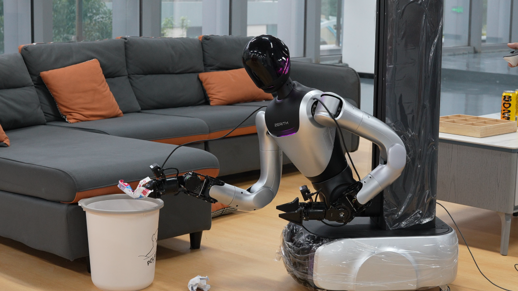 隨著人工智能和具身智能技術(shù)的加速演進(jìn),更具前瞻性的“AI+服務(wù)”探索正在開(kāi)展。在合肥零次方機(jī)器人有限公司,研發(fā)人員在公共衛(wèi)生間復(fù)刻場(chǎng)景中,訓(xùn)練一款輪臂人形機(jī)器人完成擦桌子、清潔馬桶、疊衣服、使用吸塵器打掃衛(wèi)生等任務(wù)。