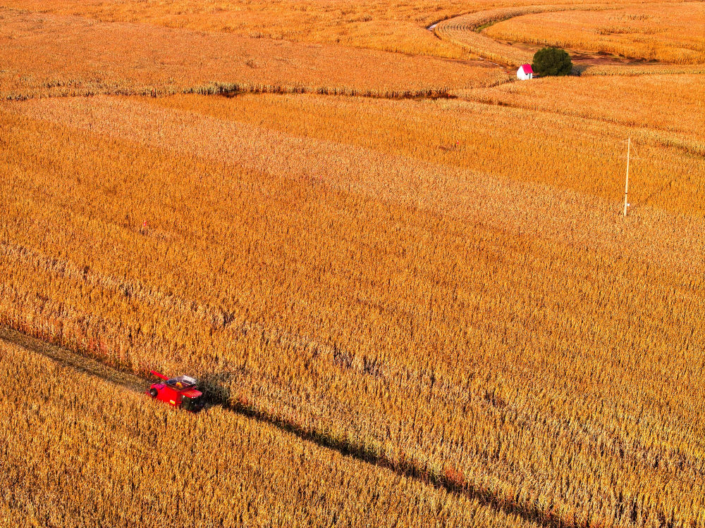 農(nóng)機手駕駛收割機在內(nèi)蒙古自治區(qū)通遼市科爾沁區(qū)豐田鎮(zhèn)收割玉米(2025年10月14日攝,無人機照片)?!笆奈濉睍r期,糧食總產(chǎn)量由2021年的1.37萬億斤增至2025年的1.43萬億斤,連續(xù)兩年站穩(wěn)在1.4萬億斤的臺階。