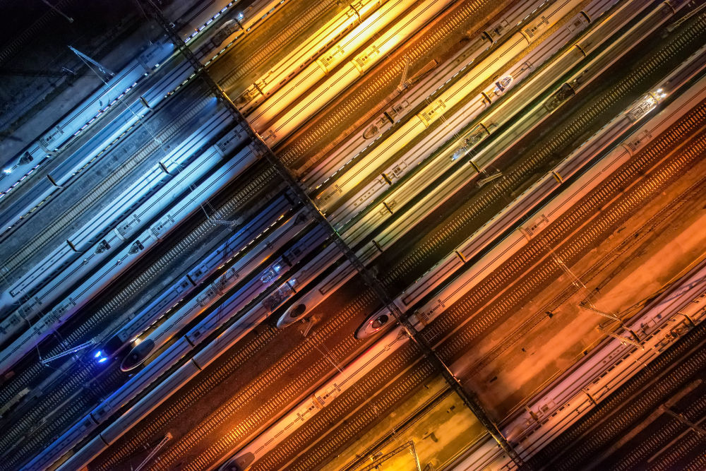 動車組列車??吭谫F陽北動車所內(nèi)(2023年1月6日攝,無人機照片)?!笆奈濉逼陂g,我國建成世界規(guī)模最大、先進發(fā)達的高速鐵路網(wǎng)。