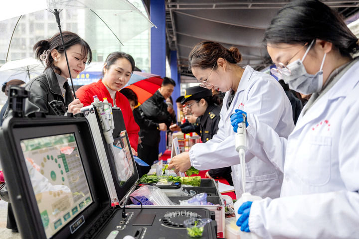 在浙江省湖州市長(zhǎng)興縣放心消費(fèi)嘉年華公益活動(dòng)現(xiàn)場(chǎng),該縣食品藥品檢驗(yàn)檢測(cè)中心工作人員為市民提供免費(fèi)果蔬檢測(cè)服務(wù)(2025年3月15日攝)。