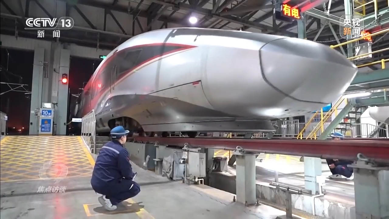 深夜時(shí)分,從廣州南站開來的G424次列車緩緩進(jìn)入檢修庫。這是一列16節(jié)編組的復(fù)興號智能動車組,頭一天它從鄭州東站出發(fā)前往廣州南站,又從廣州南站到北京西站,稍作停留后,第二天又開回廣州南站,最后返回鄭州東站。相當(dāng)于兩天的時(shí)間,就在大半個(gè)中國跑了一個(gè)來回。