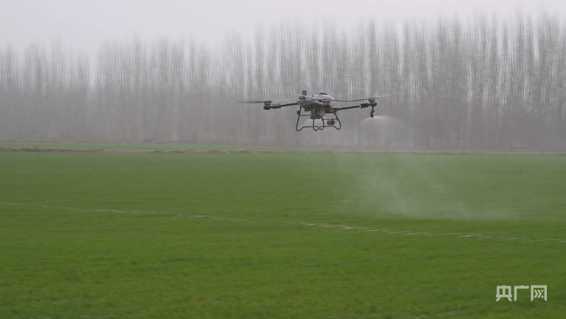 植保無人機(jī)正在阿克蘇市麥田上空開展飛防作業(yè) (央廣網(wǎng)發(fā) 熱普亥提·阿不力米提 攝)
