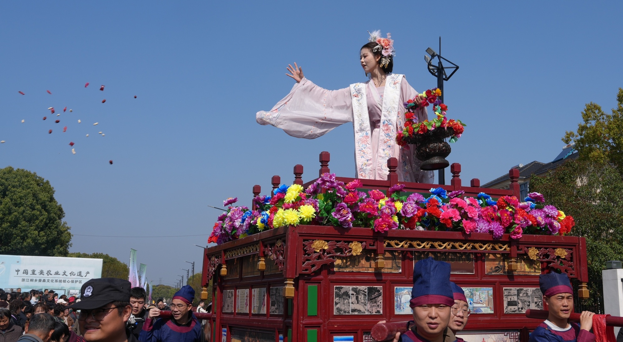 當(dāng)天上午,蠶花“禮”民俗儀式上,每一個(gè)環(huán)節(jié)都承載著蠶鄉(xiāng)兒女對(duì)風(fēng)調(diào)雨順、蠶花茂盛的美好祈愿。最令人期待的當(dāng)屬民俗巡游展演。來自桐鄉(xiāng)全市各鎮(zhèn)(街道)的民間民俗隊(duì)伍浩浩蕩蕩穿行于村道之間;蠶花仙子與十二花神乘花船翩然而至,沿途撒下寄托祝福的蠶花,與游客互動(dòng)答題。