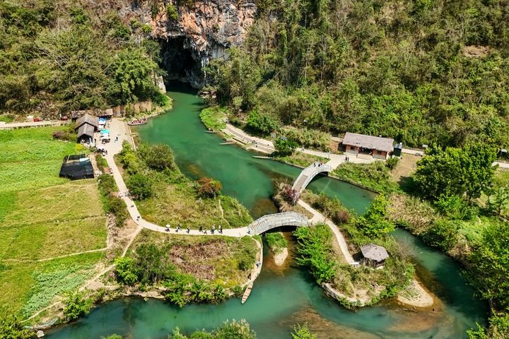 2026年3月17日,游客在云南省文山壯族苗族自治州廣南縣壩美景區(qū)游覽(無人機照片)。近年來,當?shù)厣钊胪诰驂蚊来遛r(nóng)文旅融合發(fā)展?jié)摿Γ环矫娲蛟斐两铰糜误w驗項目,讓游客在欣賞自然風光的同時,感受壯鄉(xiāng)傳統(tǒng)農(nóng)耕文化;另一方面景區(qū)積極吸納本地村民就業(yè),鼓勵其因地制宜創(chuàng)業(yè)增收,推動農(nóng)業(yè)與旅游業(yè)互促共進。新華社記者 彭奕凱 攝