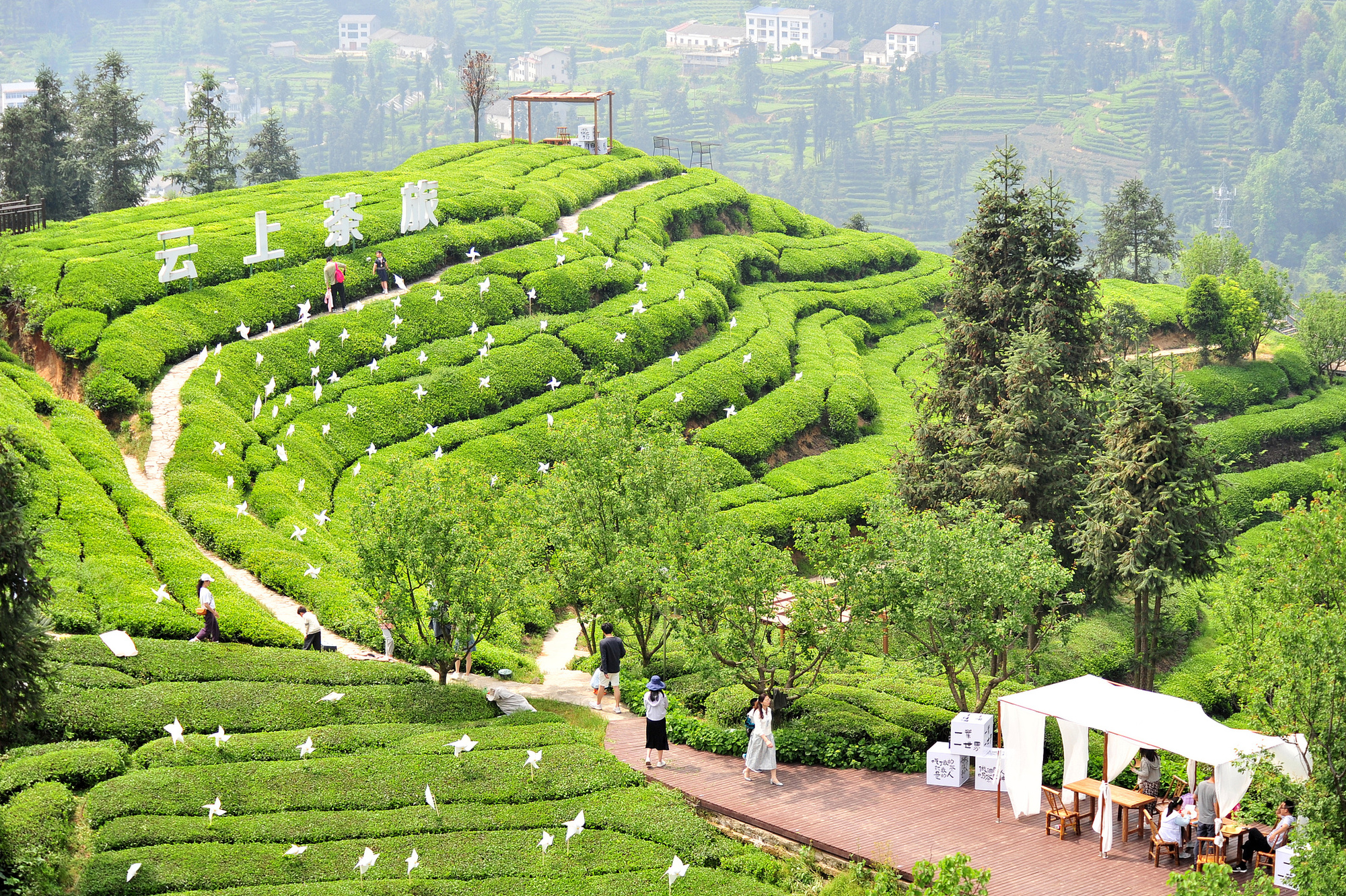 (湖北宜昌,游客“采茶春山上”,在茶壟間觀光、采摘)