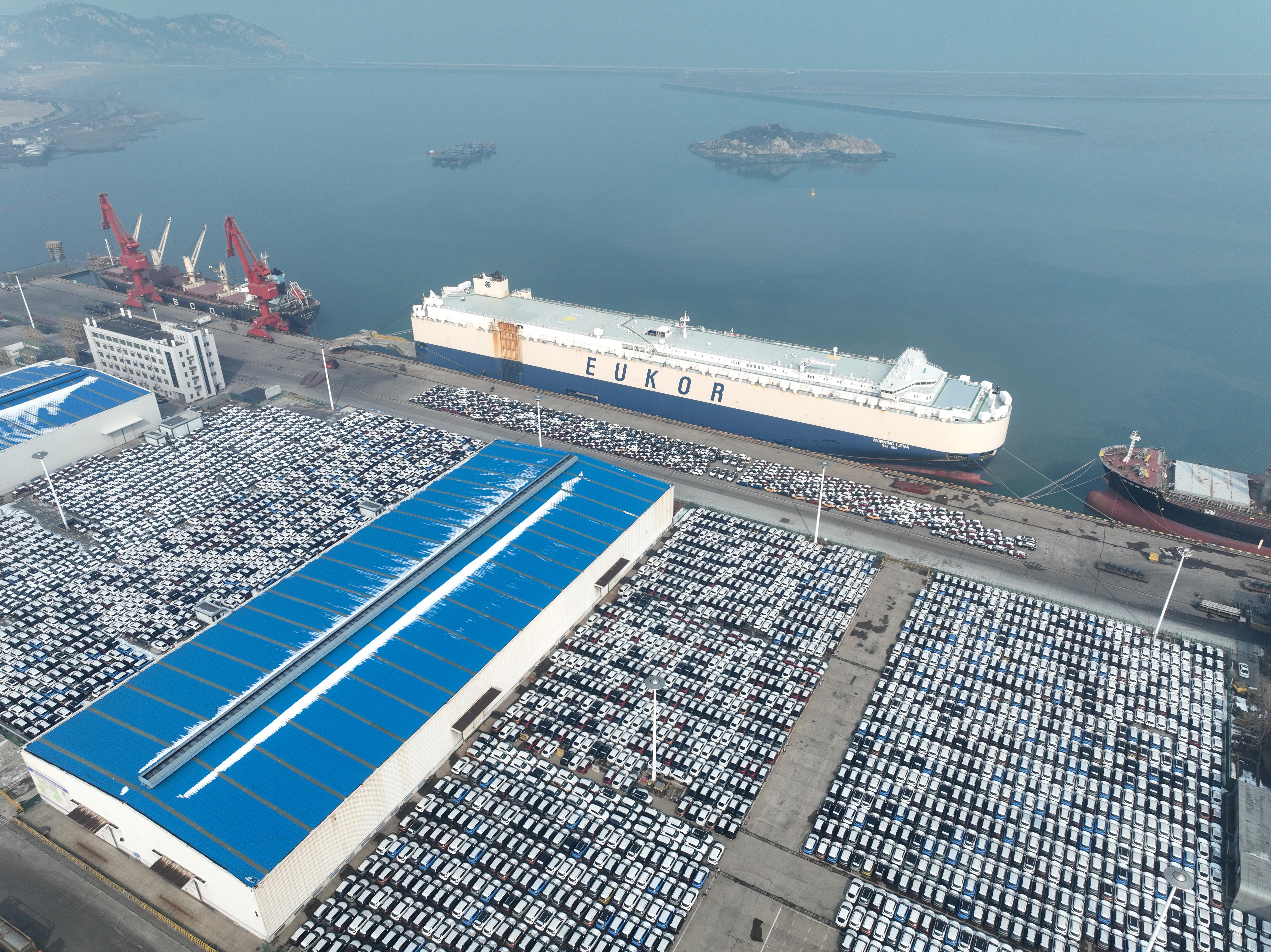在江蘇連云港港東方港務分公司碼頭,貨輪靠泊準備裝載汽車出口海外。