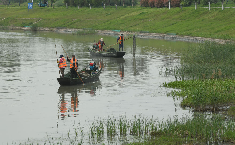 2024年4月11日,在浙江省湖州市吳興區(qū),河道保潔員在太湖沿岸清理非法捕魚(yú)地籠網(wǎng)。