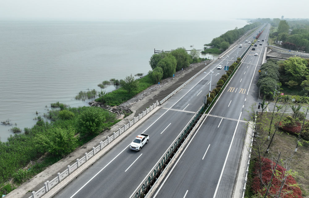 2024年4月11日,浙江省湖州市吳興區(qū)綜合行政執(zhí)法局高新區(qū)中隊(duì)執(zhí)法人員駕車(chē)在太湖沿岸巡查 (無(wú)人機(jī)照片)。