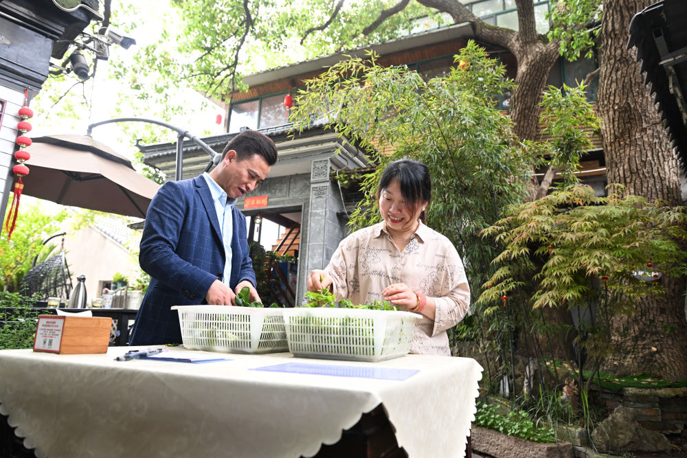 2024年4月11日,在江蘇省蘇州市吳中區(qū)金庭鎮(zhèn),退捕漁民沈雪榮和妻子沈燕燕在自家經(jīng)營(yíng)的農(nóng)家樂(lè)“美味漁家蟹園”擇菜。“退捕后,太湖的生態(tài)環(huán)境越來(lái)越好,游客越來(lái)越多,我們家的農(nóng)家樂(lè)生意也越來(lái)越紅火?!鄙蜓s感慨道。