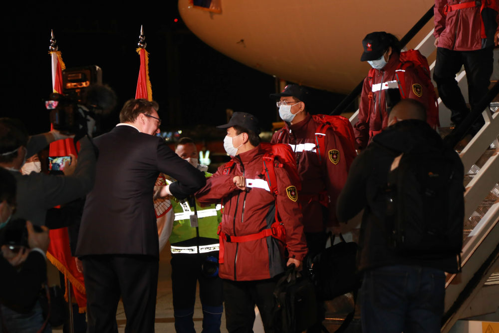 這是2020年3月21日,在塞爾維亞首都貝爾格萊德,前來迎接的塞爾維亞總統(tǒng)武契奇(左)與中國援助塞爾維亞抗疫醫(yī)療專家組成員“碰肘”致意。新華社記者 石中玉 攝