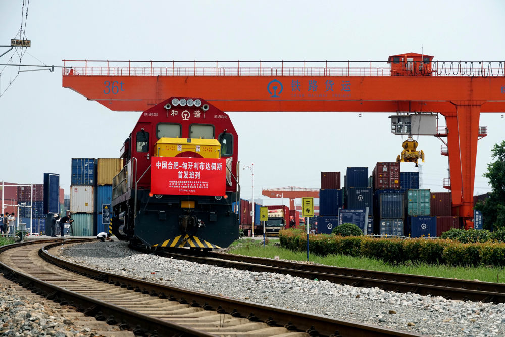 2022年7月29日,合肥至匈牙利布達佩斯的中歐班列從合肥北站物流基地駛出,標(biāo)志著合肥中歐班列通往匈牙利布達佩斯的線路正式開通。新華社發(fā)(席靜玉攝)