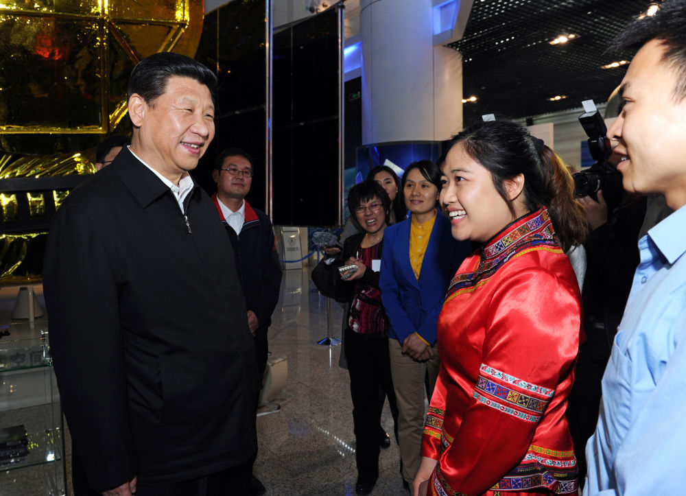 2013年5月4日,習(xí)近平來(lái)到中國(guó)航天科技集團(tuán)公司中國(guó)空間技術(shù)研究院,同各界優(yōu)秀青年代表座談并發(fā)表重要講話。這是座談會(huì)前,習(xí)近平和在展廳參觀的優(yōu)秀青年代表交談。