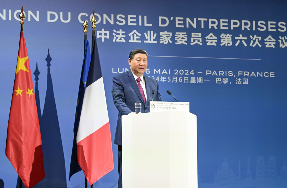 當(dāng)?shù)貢r(shí)間5月6日下午,國家主席習(xí)近平在巴黎同法國總統(tǒng)馬克龍共同出席中法企業(yè)家委員會(huì)第六次會(huì)議閉幕式,并發(fā)表題為《繼往開來,攜手開創(chuàng)中法合作新時(shí)代》的重要致辭。兩國元首同中法企業(yè)家代表合影,隨后共同步入劇院禮堂。