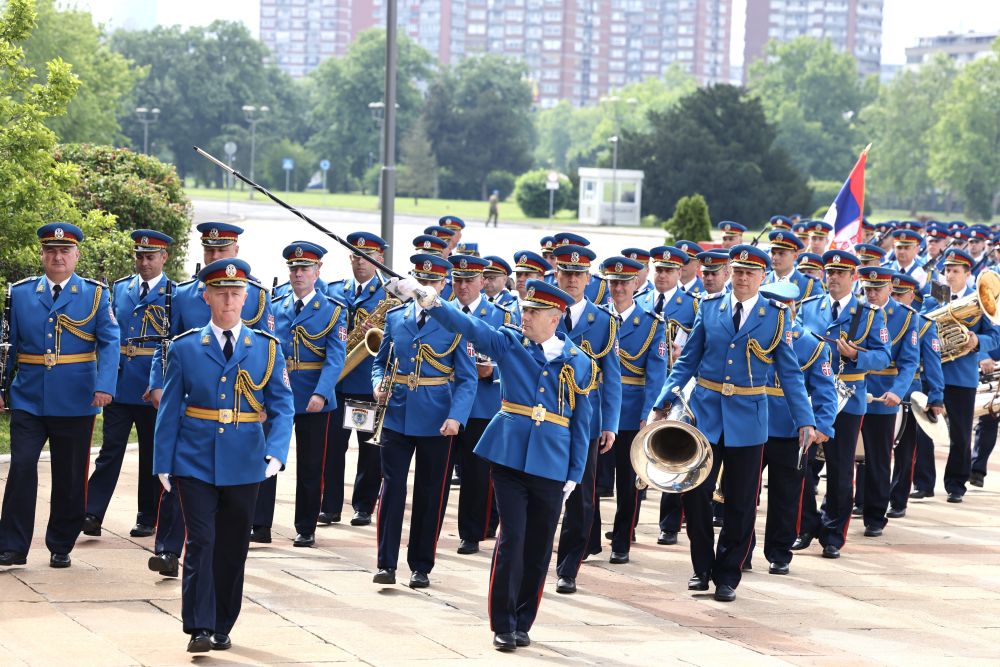 塞爾維亞大廈前,中塞兩國國旗迎風(fēng)飄揚(yáng),儀仗隊威武雄壯。