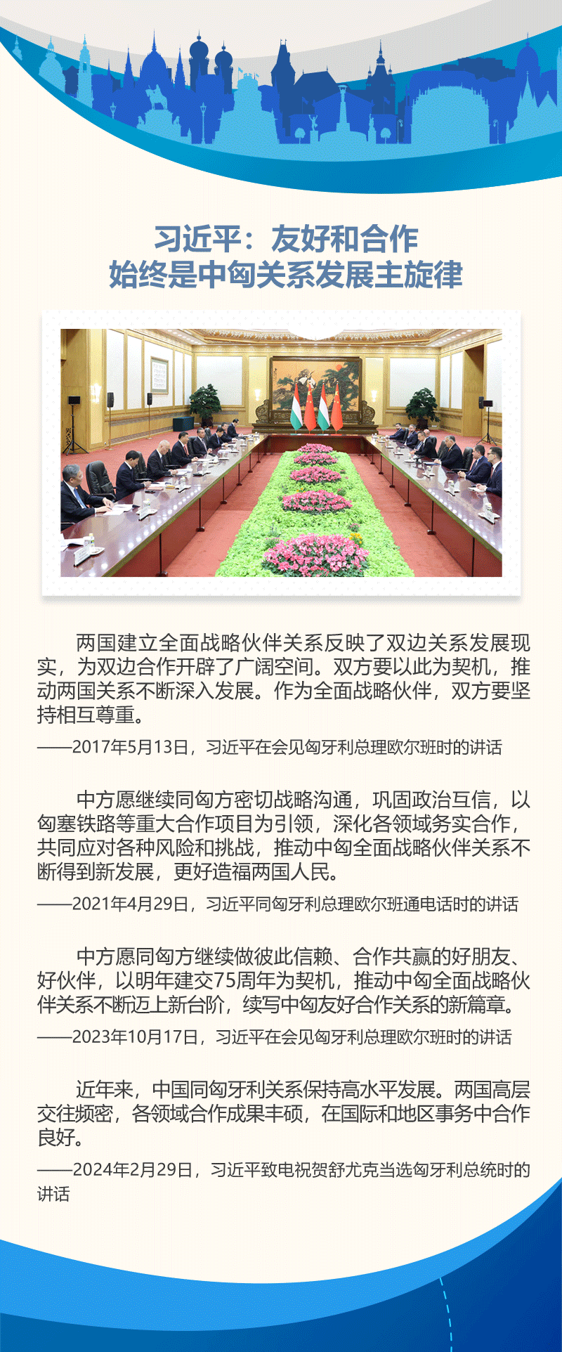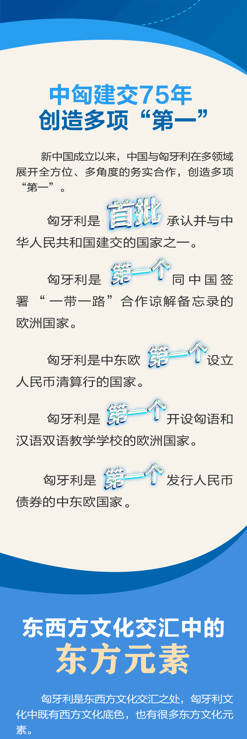 中國與匈牙利的傳統(tǒng)友誼源遠流長。建交75年來,雙方在國際事務中相互支持、密切配合。近年來,在兩國領導人的戰(zhàn)略引領下,中匈關系始終保持高水平發(fā)展。雙方政治互信不斷加深,互利合作成果豐碩,人文交流豐富多彩,在國際和地區(qū)事務中協(xié)作良好。