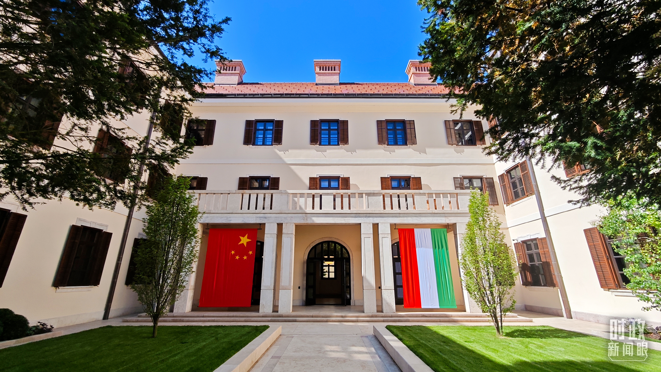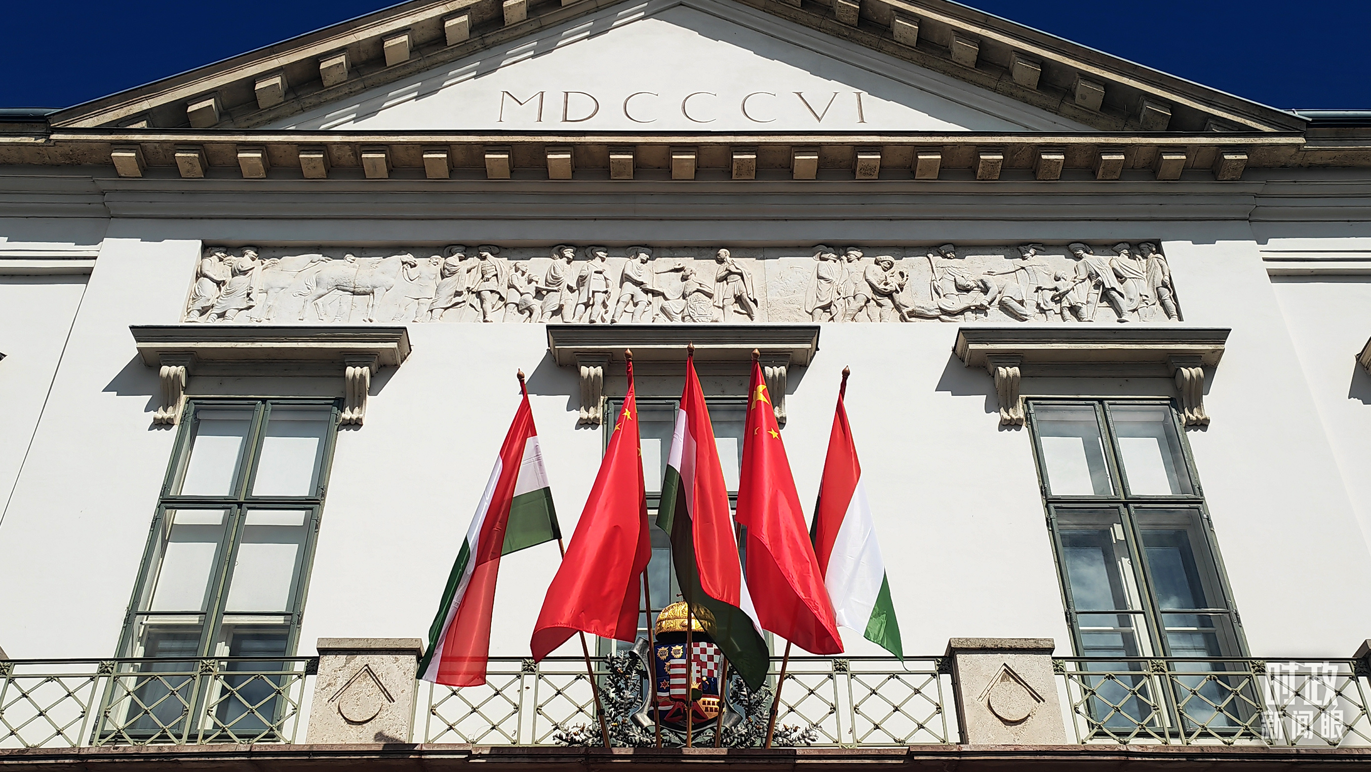 匈牙利總統(tǒng)府前懸掛的中匈兩國國旗。(總臺央視記者劉琦拍攝)