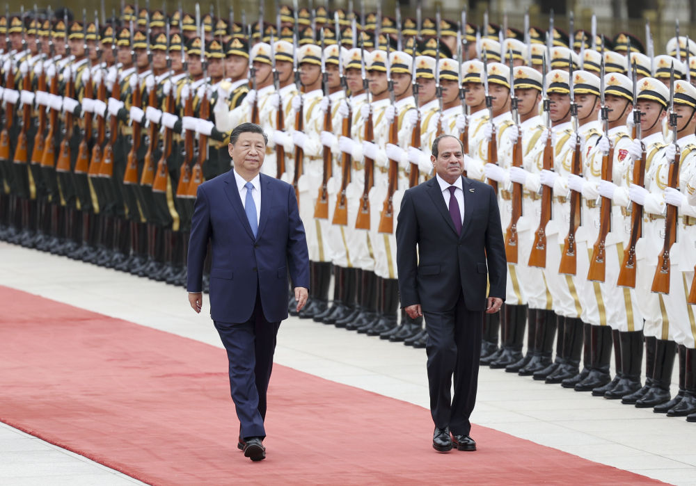 5月29日下午,國(guó)家主席習(xí)近平在北京人民大會(huì)堂同來華出席中國(guó)-阿拉伯國(guó)家合作論壇第十屆部長(zhǎng)級(jí)會(huì)議開幕式并進(jìn)行國(guó)事訪問的埃及總統(tǒng)塞西舉行會(huì)談。這是會(huì)談前,習(xí)近平在人民大會(huì)堂東門外廣場(chǎng)為塞西舉行歡迎儀式。新華社記者 翟健嵐 攝
