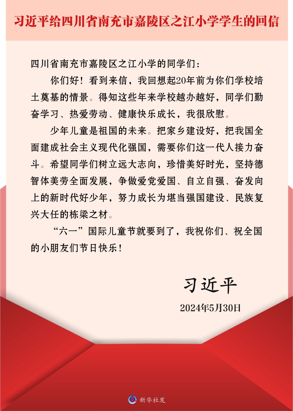 在“六一”國(guó)際兒童節(jié)即將到來之際,中共中央總書記、國(guó)家主席、中央軍委主席習(xí)近平5月30日給四川省南充市嘉陵區(qū)之江小學(xué)的學(xué)生們回信,對(duì)他們予以親切勉勵(lì),并祝他們和全國(guó)的少年兒童節(jié)日快樂。
