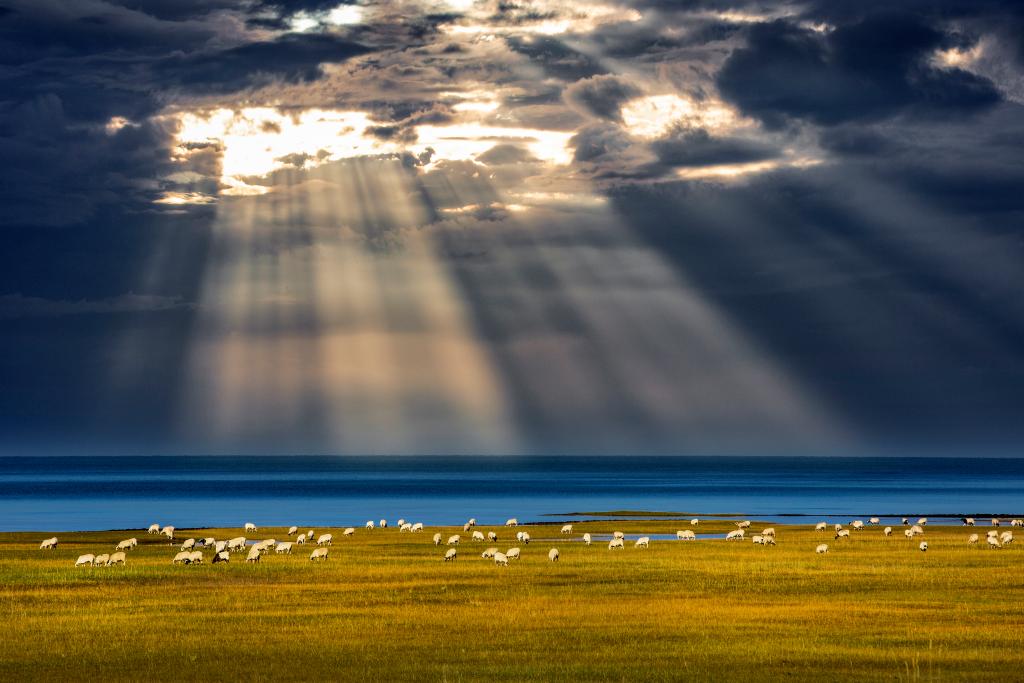 清晨,一道泛著紅暈的光從煙波浩渺的湖面徐徐升起,大湖之畔,氈房點(diǎn)點(diǎn),牛羊滿坡,野花綻放。