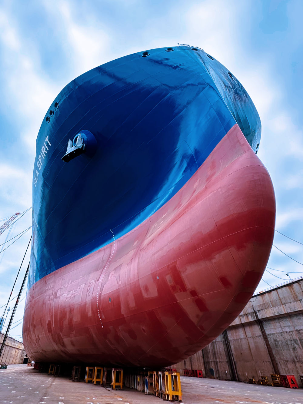 ?。对碌拇筮B,碧海流云。中國(guó)船舶集團(tuán)大連船舶重工集團(tuán)有限公司(簡(jiǎn)稱“中國(guó)船舶大連造船”)一艘正在建造的17.5萬立方米LNG運(yùn)輸船??吭诖a頭,400多名工人上上下下,正在進(jìn)行貨物圍護(hù)系統(tǒng)的施工。