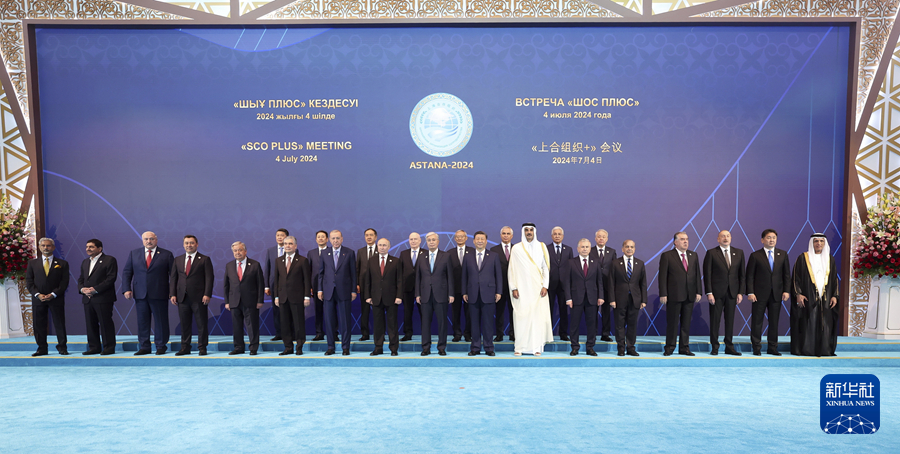 當(dāng)?shù)貢r(shí)間7月4日下午,國家主席習(xí)近平在阿斯塔納出席“上海合作組織+”阿斯塔納峰會并發(fā)表題為《攜手構(gòu)建更加美好的上海合作組織家園》的重要講話。峰會開始前,習(xí)近平出席托卡耶夫?yàn)榕c會代表團(tuán)團(tuán)長舉行的歡迎宴會并集體合影。
