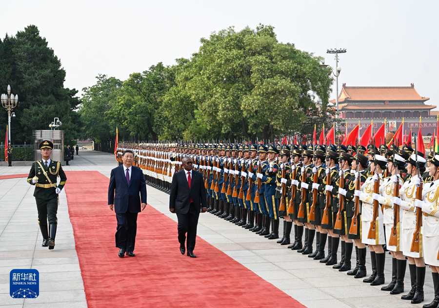 7月10日下午,國(guó)家主席習(xí)近平在北京人民大會(huì)堂同來華進(jìn)行國(guó)事訪問的幾內(nèi)亞比紹總統(tǒng)恩巴洛舉行會(huì)談。這是會(huì)談前,習(xí)近平在人民大會(huì)堂東門外廣場(chǎng)為恩巴洛舉行歡迎儀式。新華社記者 丁林 攝