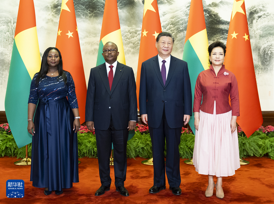 7月10日下午,國(guó)家主席習(xí)近平在北京人民大會(huì)堂同來華進(jìn)行國(guó)事訪問的幾內(nèi)亞比紹總統(tǒng)恩巴洛舉行會(huì)談。這是會(huì)談前,習(xí)近平和夫人彭麗媛同恩巴洛和夫人迪尼西婭合影。新華社記者 黃敬文 攝