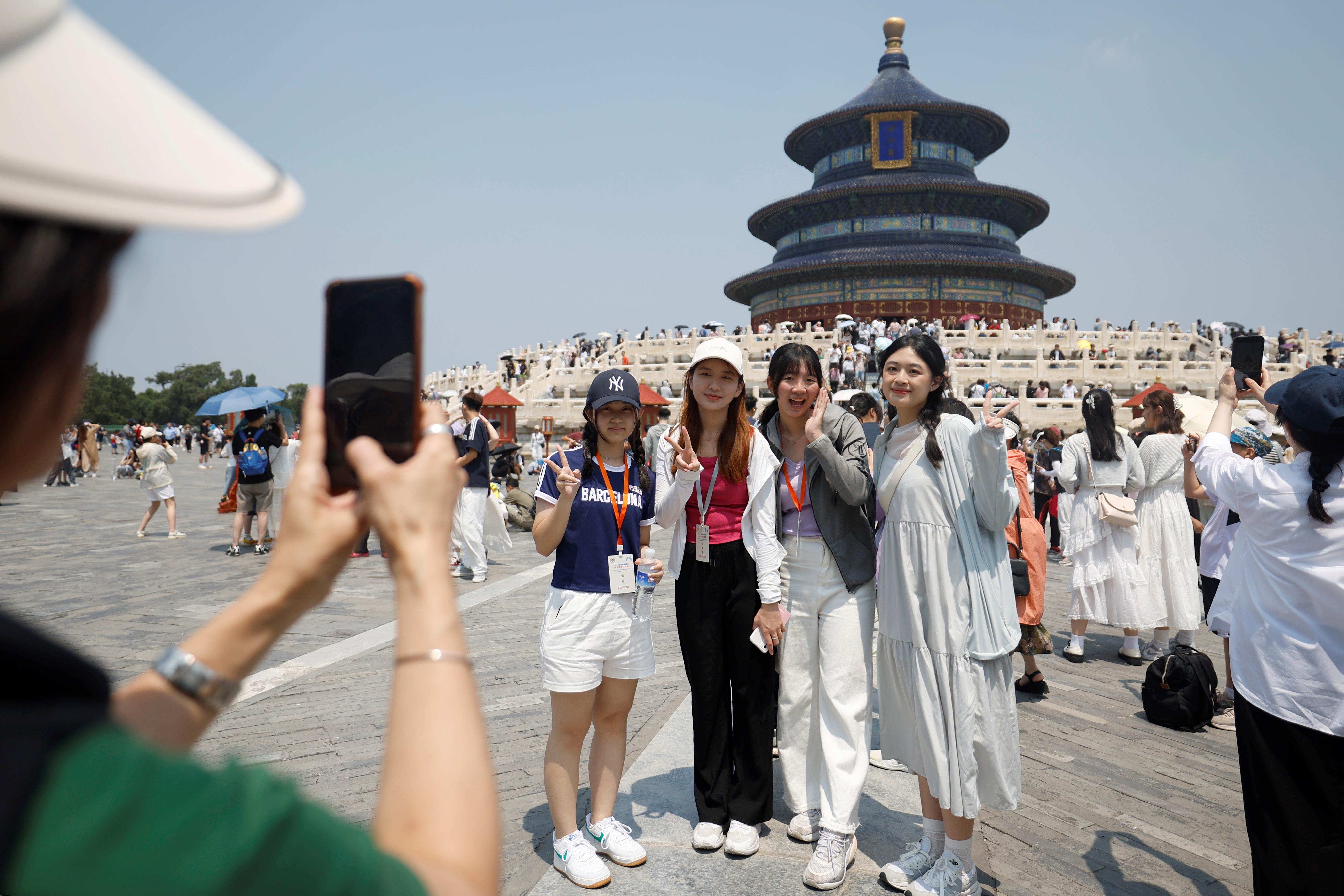2024年7月3日,臺(tái)灣青年在天壇公園拍照留念。當(dāng)日,2024“未來(lái)能源領(lǐng)袖”兩岸青年交流營(yíng)的營(yíng)員參觀游覽北京的奧林匹克公園、天壇公園等地。