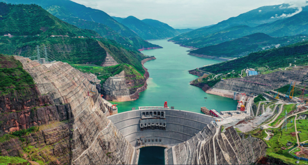 在云南省巧家縣和四川省寧南縣交界的金沙江峽谷中,上游而來的金沙江水被白鶴灘水電站大壩截住,“高峽出平湖”的景色蔚為壯觀。白鶴灘水電站年均發(fā)電量可達(dá)624億千瓦時,是金沙江峽谷中的“綠色引擎”之一。