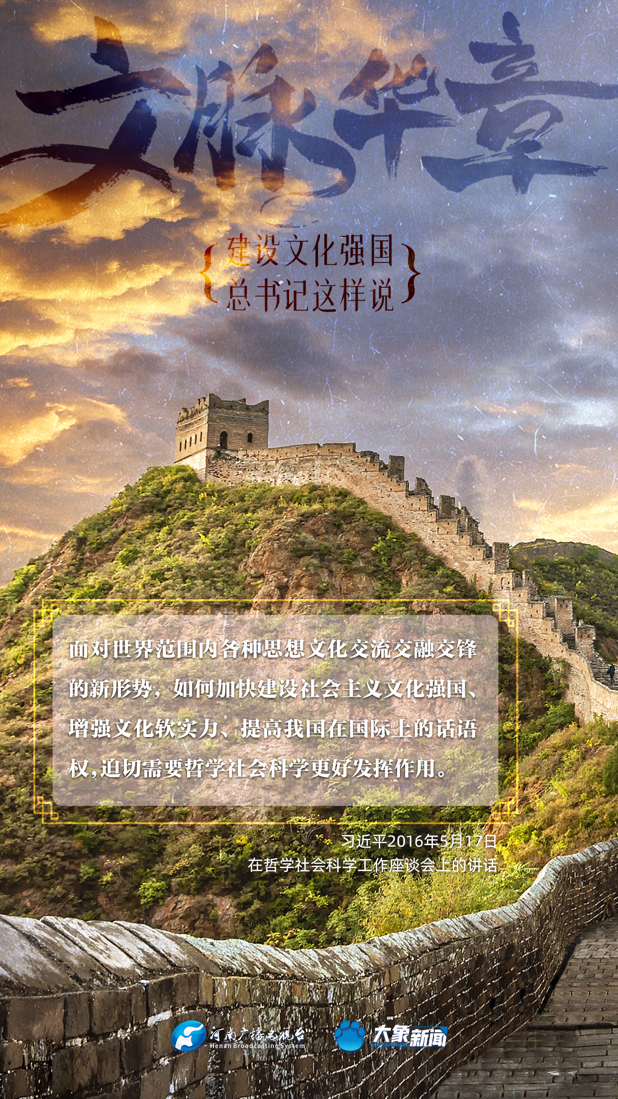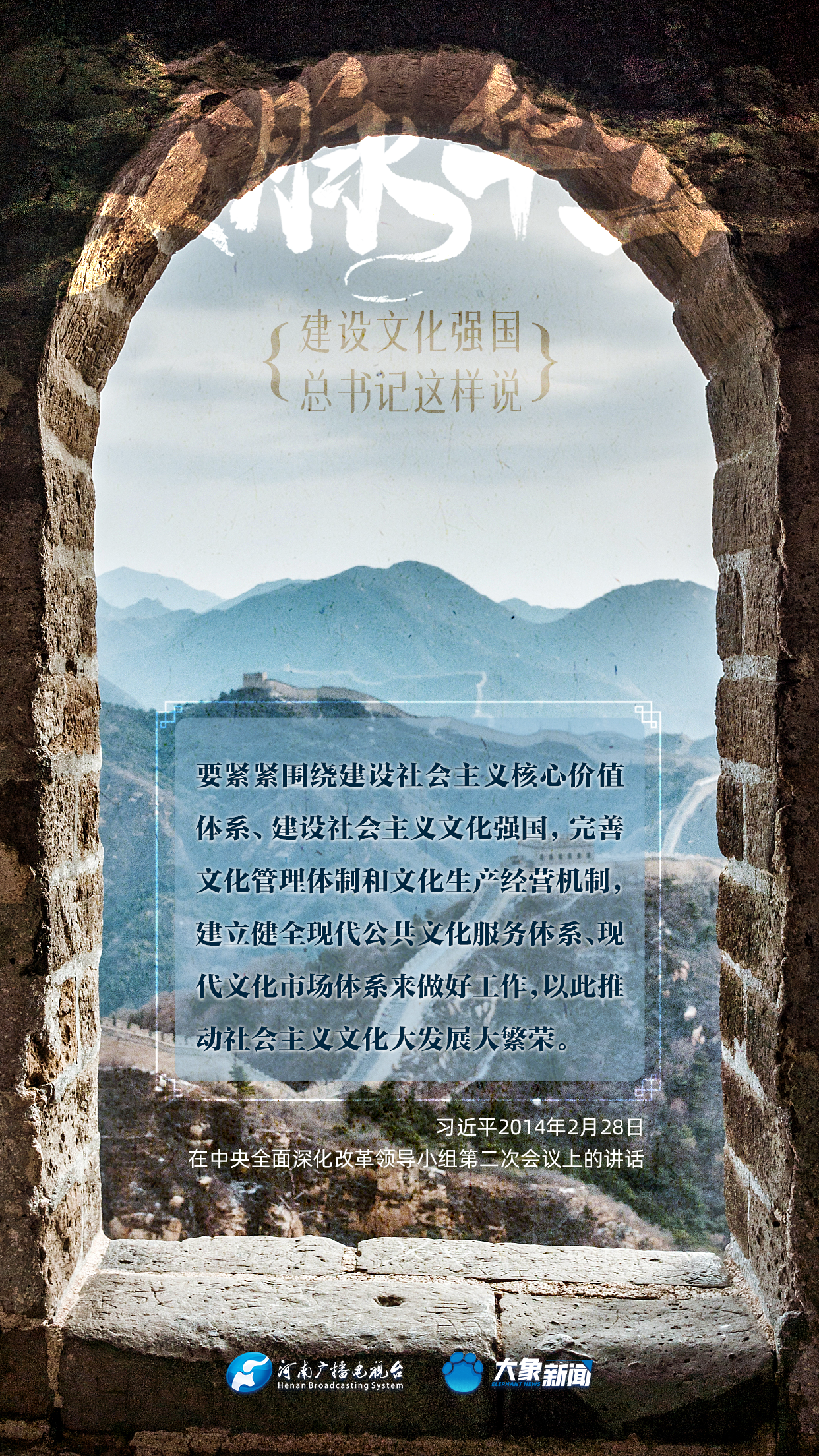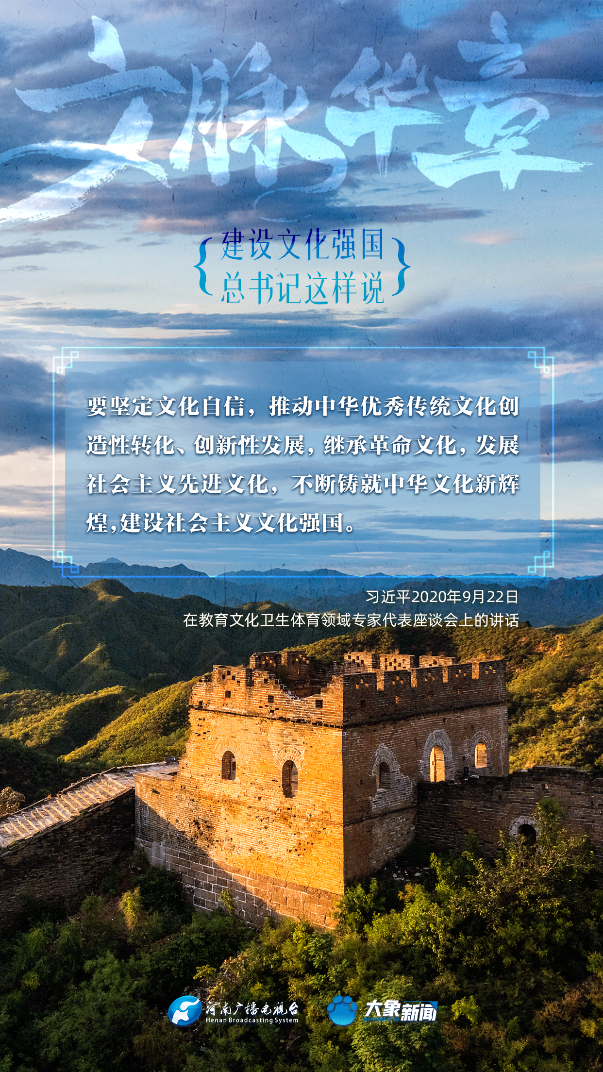 黨的十八大以來,習近平總書記站在全局和戰(zhàn)略高度,就建設社會主義文化強國提出一系列新思想新觀點新論斷,為我們堅定文化自信,堅持中國特色社會主義文化發(fā)展道路,提供了指引。大象新聞與您一起學習、領悟。