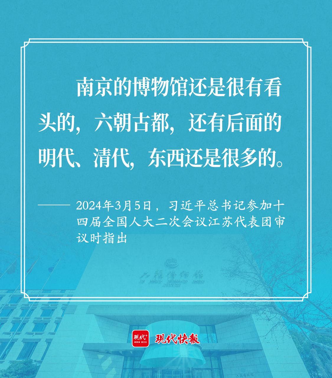 2024年3月5日,習(xí)近平總書記參加十四屆全國人大二次會(huì)議江蘇代表團(tuán)審議??倳浽诼犕昴暇┦胁┪锟傪^副館長宋燕代表講述后表示,“南京的博物館還是很有看頭的,六朝古都,還有后面的明代、清代,東西還是很多的?!?/p>