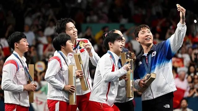 巴黎奧運會乒乓球混合雙打頒獎儀式結束后,中朝韓運動員聚到一起合影的場景,在朋友圈刷了屏。