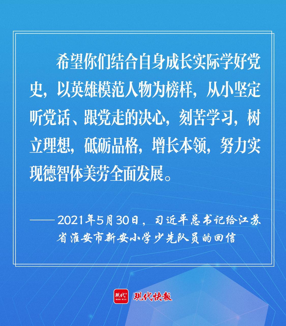 2021年5月30日,習近平總書記給江蘇省淮安市新安小學少先隊員回信時強調,“希望你們結合自身成長實際學好黨史,以英雄模范人物為榜樣,從小堅定聽黨話、跟黨走的決心,刻苦學習,樹立理想,砥礪品格,增長本領,努力實現(xiàn)德智體美勞全面發(fā)展?!?/p>