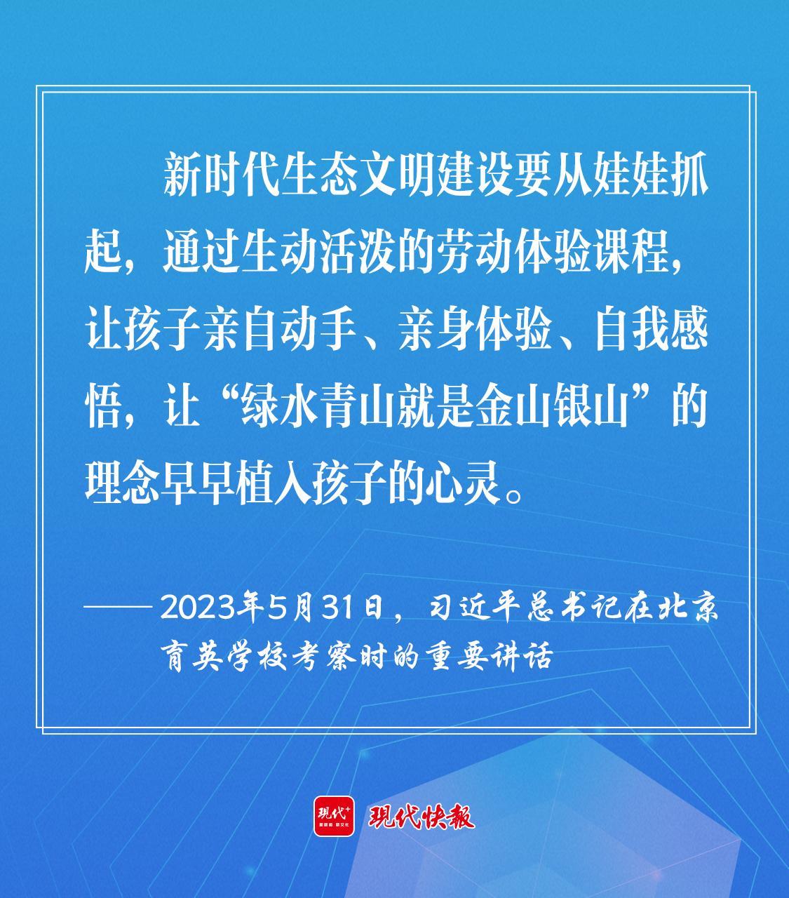 2023年5月,習近平總書記在北京育英學校考察時強調,新時代生態(tài)文明建設要從娃娃抓起,通過生動活潑的勞動體驗課程,讓孩子親自動手、親身體驗、自我感悟,讓“綠水青山就是金山銀山”的理念早早植入孩子的心靈。