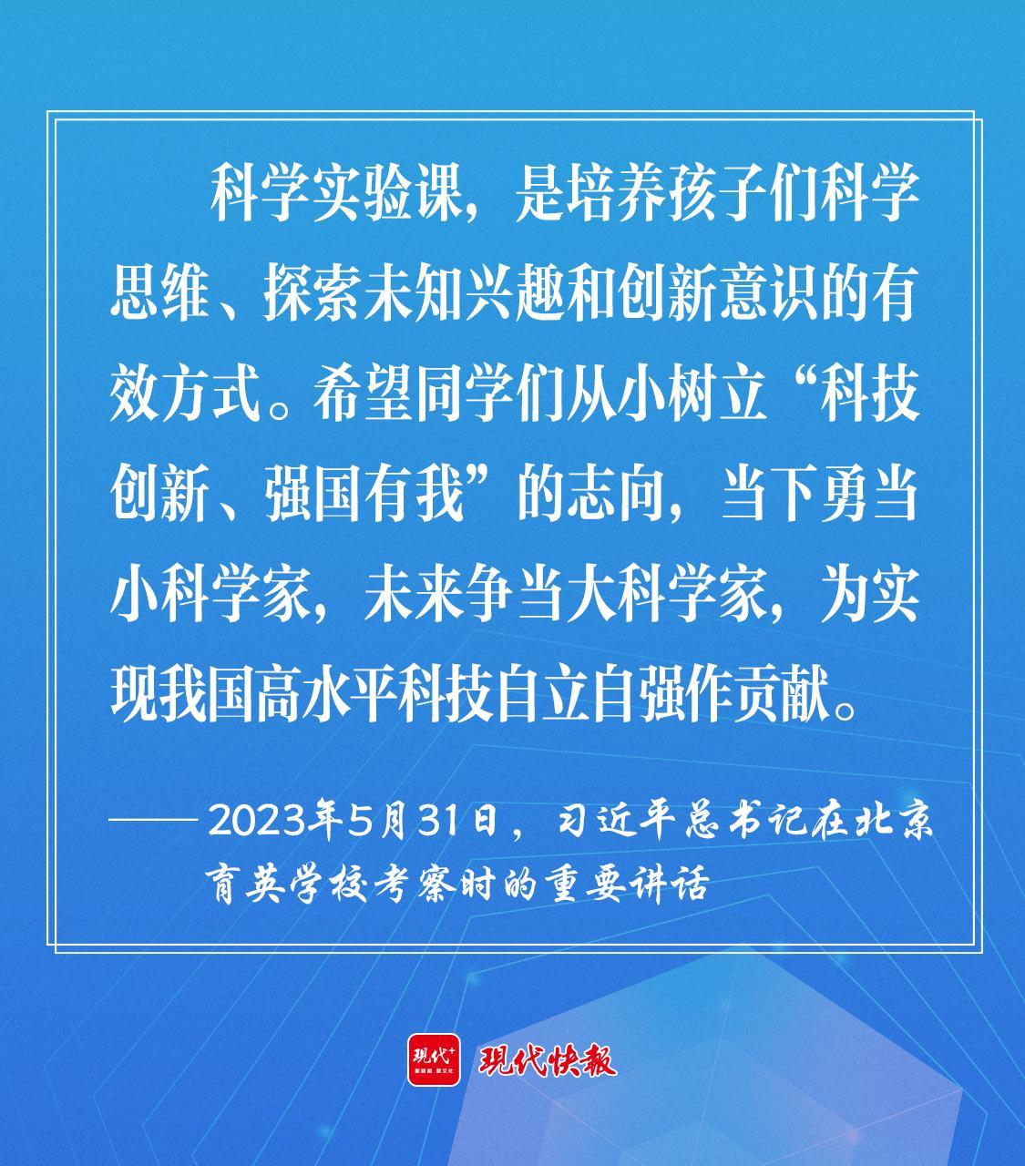 2023年5月,習近平總書記在北京育英學??疾鞎r強調,希望同學們從小樹立“科技創(chuàng)新、強國有我”的志向,當下勇當小科學家,未來爭當大科學家,為實現(xiàn)我國高水平科技自立自強作貢獻。