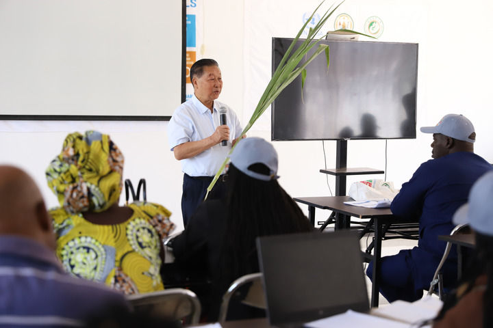 2024年8月4日,在位于盧旺達(dá)南方省胡耶區(qū)的中國(guó)援盧農(nóng)業(yè)技術(shù)示范中心,菌草發(fā)明人林占熺為培訓(xùn)班學(xué)員講解菌草技術(shù)。新華社發(fā)(黃萬(wàn)晴攝)