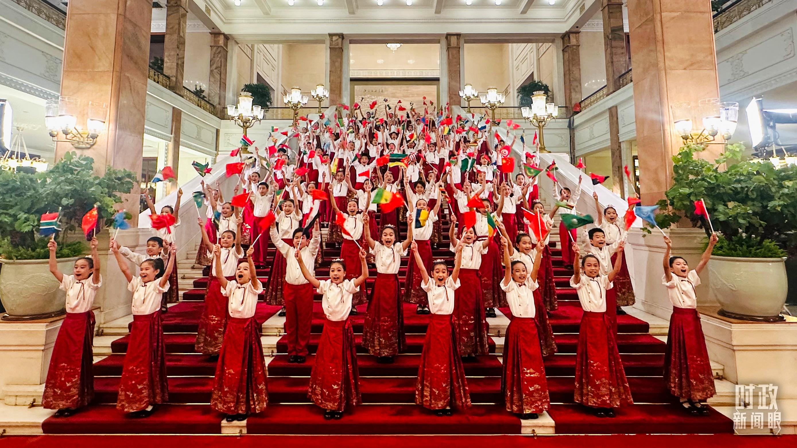 壁畫緩緩打開,百余名身著中國傳統(tǒng)服飾的少年兒童揮舞著旗幟,熱情演唱《把未來點亮》、《歌聲與微笑》、非洲歌曲《Waka Waka》等。