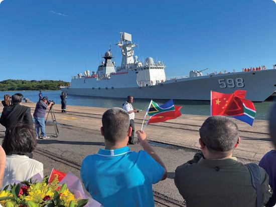 △聯(lián)合演習(xí)開始前一天,中國(guó)海軍日照艦抵達(dá)南非理查茲灣港口,受到歡迎