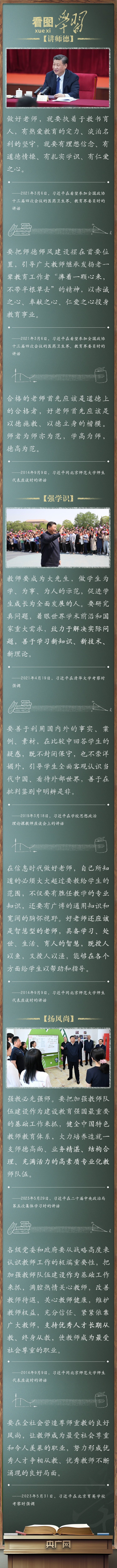教育大計(jì),教師為本。黨的十八大以來(lái),以習(xí)近平同志為核心的黨中央堅(jiān)持把教育擺在優(yōu)先發(fā)展的戰(zhàn)略位置,推動(dòng)新時(shí)代教育事業(yè)取得歷史性成就、發(fā)生格局性變化。習(xí)近平總書(shū)記緊扣“培養(yǎng)什么人、怎樣培養(yǎng)人、為誰(shuí)培養(yǎng)人”這一教育的根本問(wèn)題,對(duì)建設(shè)新時(shí)代高素質(zhì)專(zhuān)業(yè)化教師隊(duì)伍作出一系列重要指示,激勵(lì)廣大教師立德修身、敬業(yè)立學(xué),強(qiáng)調(diào)要在全黨全社會(huì)弘揚(yáng)尊師重教的社會(huì)風(fēng)尚。在第四十個(gè)教師節(jié)到來(lái)之際,讓我們一起牢記并踐行總書(shū)記的殷殷囑托!