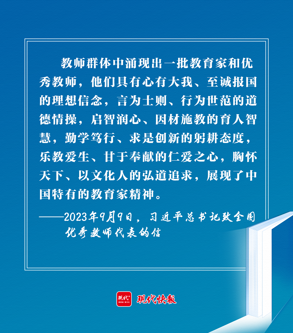 2023年9月9日,習(xí)近平總書記在致全國優(yōu)秀教師代表的信中強調(diào):“新征程上,希望你們和全國廣大教師以教育家為榜樣,大力弘揚教育家精神,牢記為黨育人、為國育才的初心使命,樹立‘躬耕教壇、強國有我’的志向和抱負,自信自強、踔厲奮發(fā),為強國建設(shè)、民族復(fù)興偉業(yè)作出新的更大貢獻。”