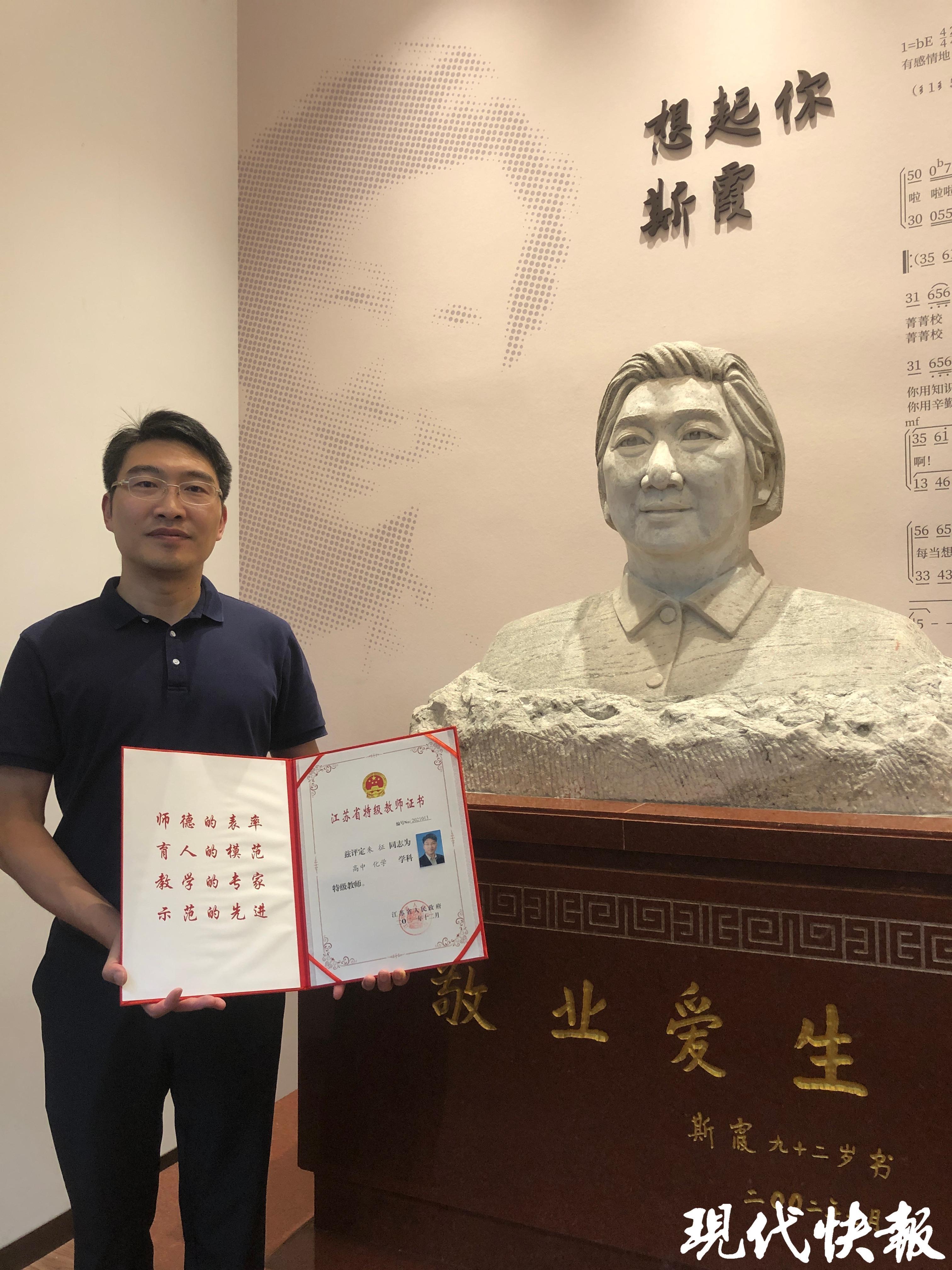今年9月的一個下午,朱征走進南京市中華中學(xué)高一的課堂,為學(xué)生們上化學(xué)課。朱征是江蘇省化學(xué)特級教師,也是中華中學(xué)校長,已經(jīng)從教24年。他的另一個身份,是著名教育家斯霞最小的孫輩,從斯霞老師算起,家中三代人出了11位教師。