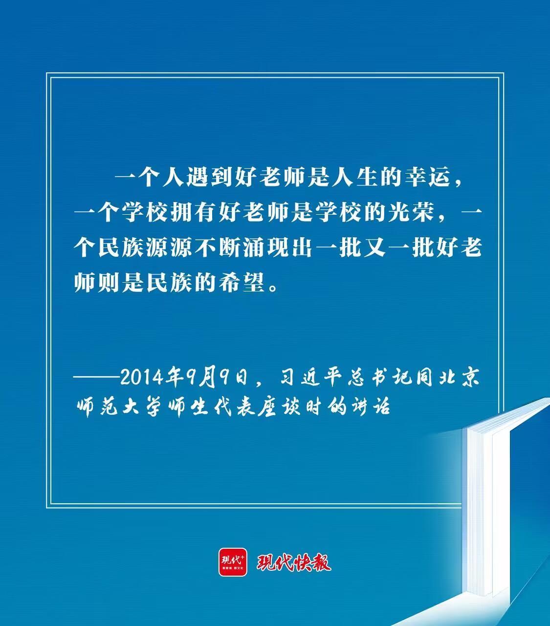 “一個人遇到好老師是人生的幸運,一個學(xué)校擁有好老師是學(xué)校的光榮,一個民族源源不斷涌現(xiàn)出一批又一批好老師則是民族的希望?!?014年教師節(jié)前夕,同北京師范大學(xué)師生代表座談時,習(xí)近平總書記的殷殷期盼,激勵廣大教師為民族復(fù)興拼搏奮斗。