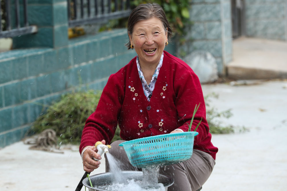 近日,在定西市隴西縣雙泉鎮(zhèn)癿羊口村,68歲的村民何淑蘭用引洮工程引來(lái)的自來(lái)水洗菜。新華社記者 郎兵兵 攝