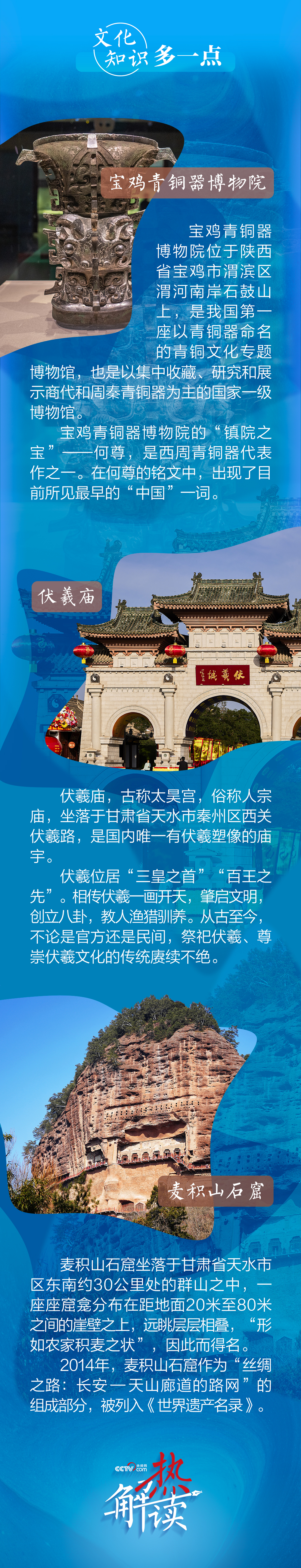熱解讀9月10日下午至11日上午,習(xí)近平總書記先后來到陜西省寶雞市和甘肅省天水市考察調(diào)研。此次陜甘行中,總書記專門考察了三處文化地標。